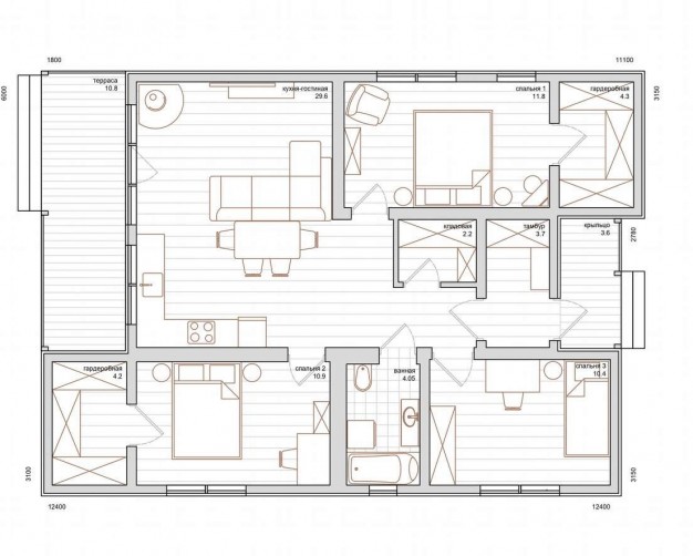 Пространство дома объединяет кухню и гостиную, есть три большие спальная комнаты, две гардеробных.