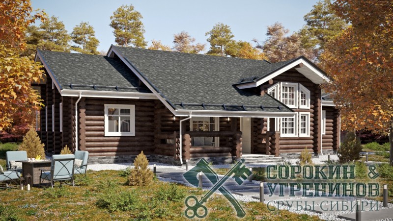 Проект дома из бревна диаметром 300мм, размер сруба по осям 14,5х18м, общая площадь дома 197м2, объём бревна в срубе 190м3. Большой одноэтажный дом со вторым светом, имеет четыре спальные комнаты, два санузла, гостиная, кухня, крыльцо, тамбур, гардеробная, терраса. Дом смотрится как двухэтажный из-за высоких потолков и второго света.