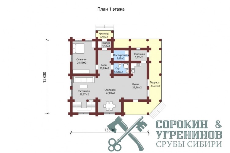 Проект дома из бревна кедра рубленый вручную, диаметр бревна 280мм, размер сруба 12,5 метров на 13,8 метров, объём бревна в срубе 250м2, площадь 282м2. Сруб дома рубленый вручную в русскую чашу обло под рубанок. Большой и просторный дом из бревна кедра, с вторым светом и большой гостиной с русской печью. Дом производился на нашей производственной площадке, установлен в Казахстане в 2013 году в городе Костанай.