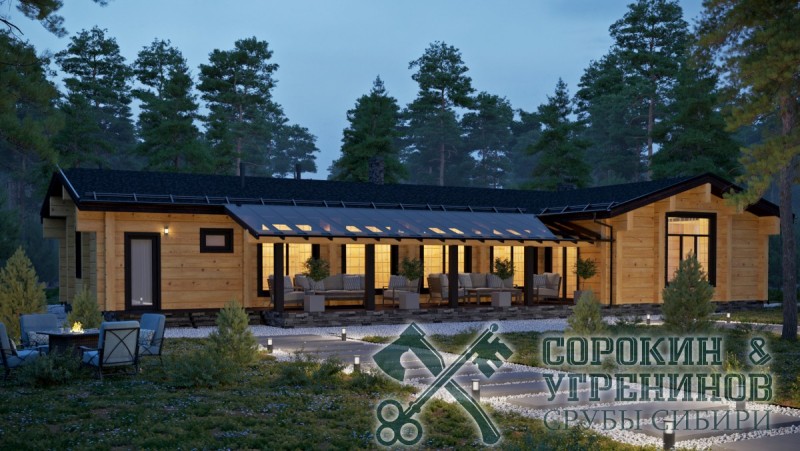 Индивидуальный проект одноэтажного жилого дома из лафета сечением 250х400мм. Общая площадь дома 305м2. Большой дом имеет т-образную форму, и два выхода на террасы, четыре спальные комнаты, три санузла, гардеробная, котельная, большая гостиная с камином, прачечная, кладовая.